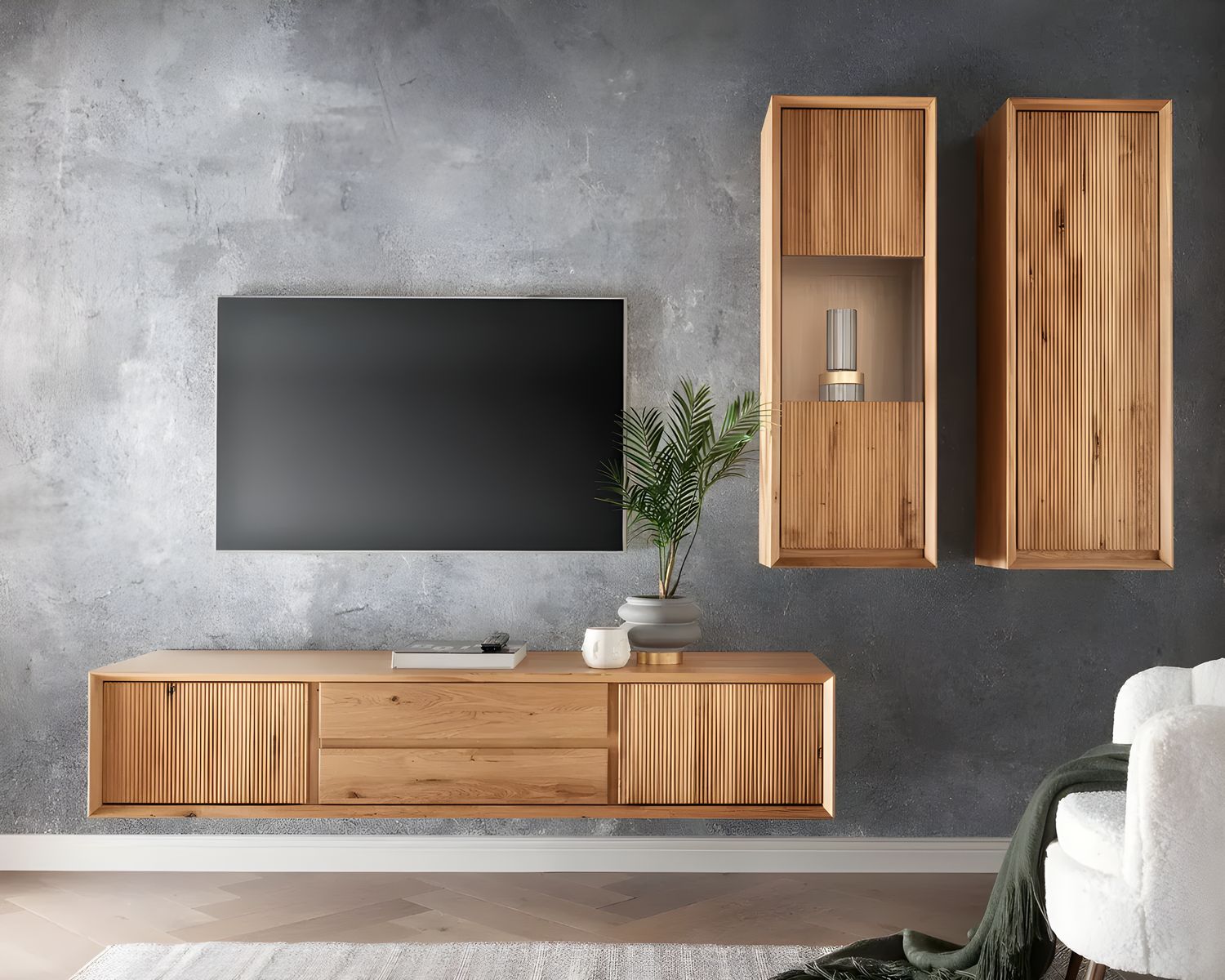 Die Rillenfronten verleiht jedem Möbelstück eine einzigartige Note, während die markante Wildeiche für einen natürlichen und rustikalen Charme sorgt.