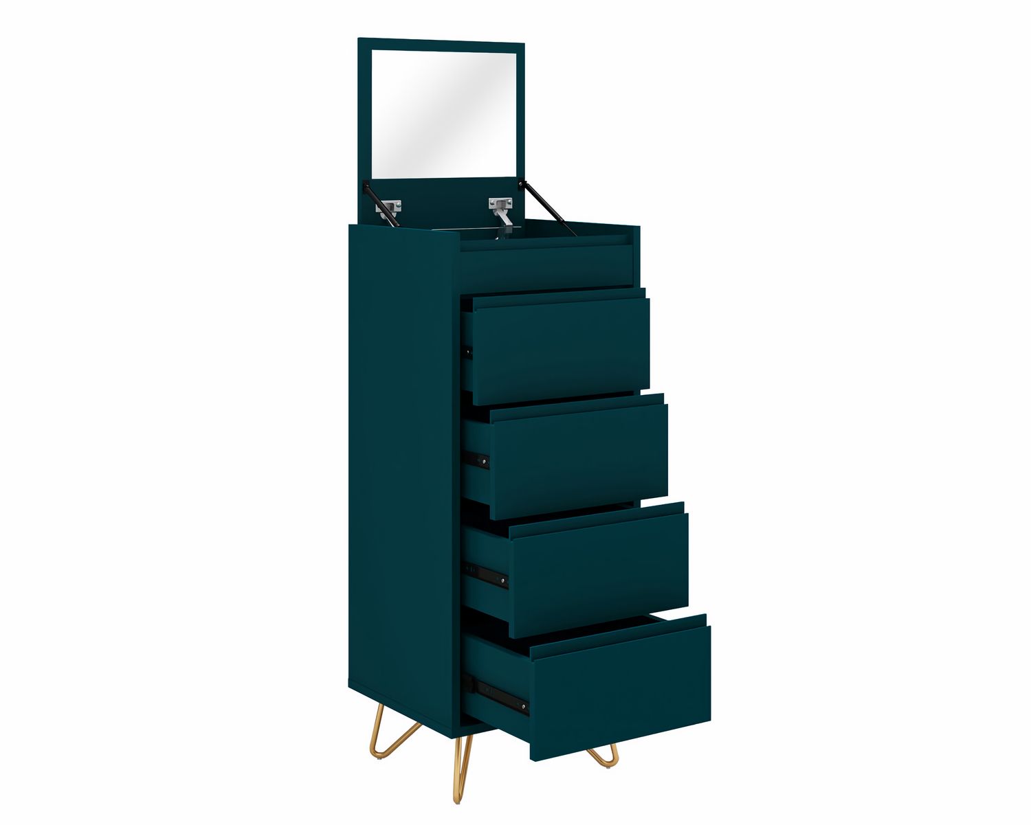 Die SalesFever »Lotta« Kommode in blau besteht aus MDF und goldenen Metallbeinen mit Messinglegierung. Die Kommode hat 4 Schubladen, 1 Fach und einen Spiegel und bietet ausreichend Stauraum. Durch das Öffnen des Deckels sehen Sie einen integrierten Spiegel. Super praktisch zum Verstauen Ihrer Schmink- und Pflegeartikel!