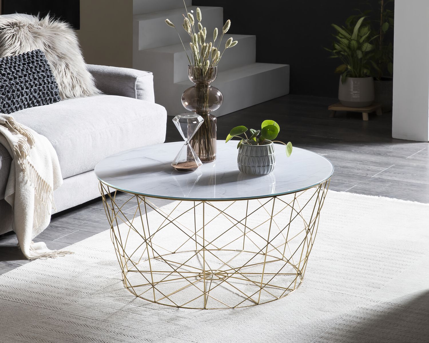 Der runde Couchtisch May vereint modernes Design mit einer Portion Extravaganz. Die Glasplatte mit unterliegender Folie in Marmoroptik passt perfekt zu dem Metallgestell in Chrom, Gold oder schwarz. Der Sofatisch bietet genügend Ablagemöglichkeiten für z.B. Obst, Knabbereien oder eine Blumenvase. Das Gestell kann als Aufbewahrungskorb für Zeitschriften genutzt werden. Durch sein attraktives Design ist dieser Couchtisch mit vielen Möbeln kombinierbar und findet auch in Ihrem Zuhause ein geeignetes Plätzchen.