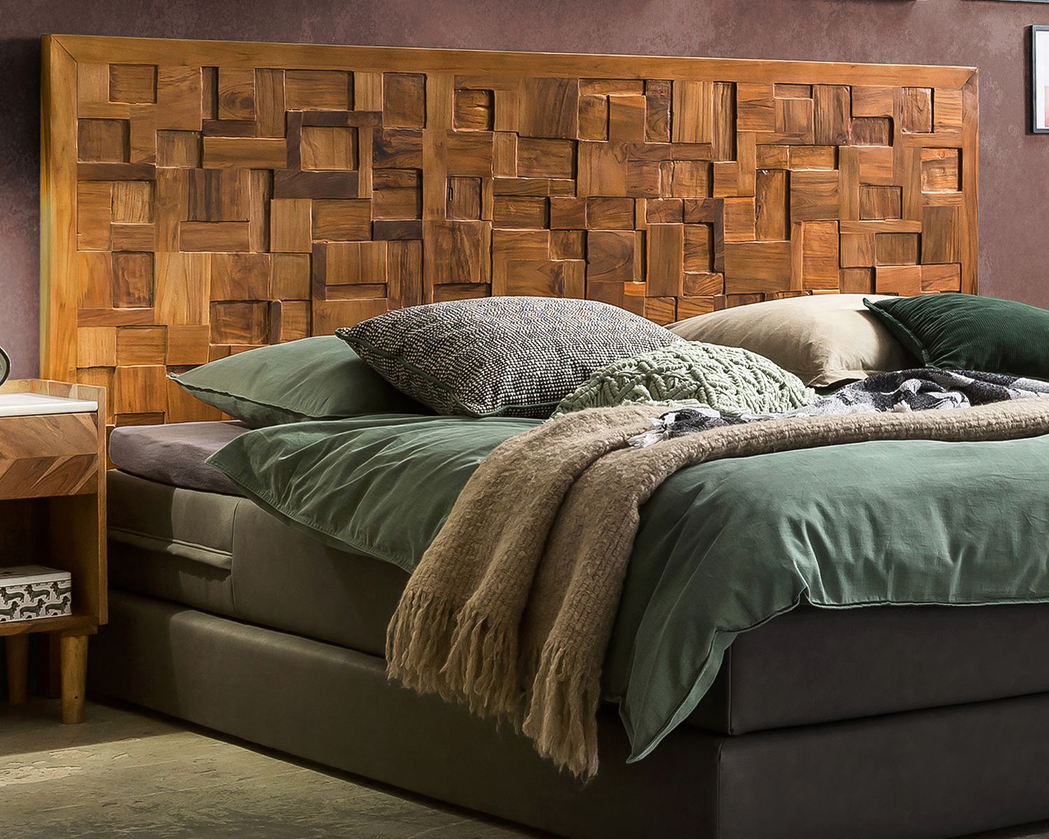 Dieses Kopfteil bringt den Wald ins Schlafzimmer. Wie ein zu groß geratenes Puzzle aus Rattan-Geflecht eingerahmt in Teak wirken die Holzplatten und machen jedes Kopfteil zu einem absoluten Einzelstück, denn keines gleicht dem anderen, was einem davorstehenden Bett eine ganz persönliche Note gibt. Die Farbe der Natur bei diesem Deko-Kopfteil ist wie gemacht für den Landhausstil, lässt sich aber hervorragend kombinieren mit Schlafzimmern im Vintage Design, Industrie Look oder Shabby Chic. Zu Rattan passt diese Form von origineller und freier Wandgestaltung ebenfalls sehr gut.